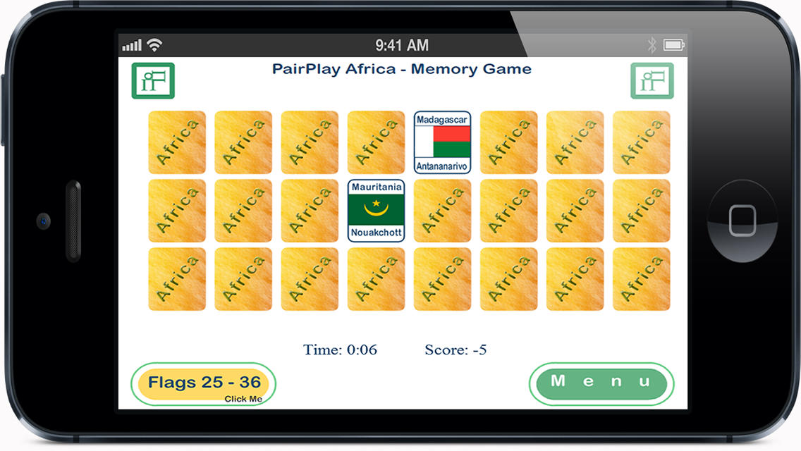 Description:PairPlay Africa - An educational memory card game that will help you develop your memory skill while learning the countries, capitals and flags of African continent.